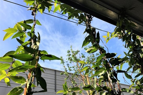 蔓科植物は北半球では右方向に巻き、南半球では左方向に巻き付きます。日本では右巻き付きになります。その自然の法則を活かし、ワイヤーと植物の系着力をより強固にすることが出来ます。