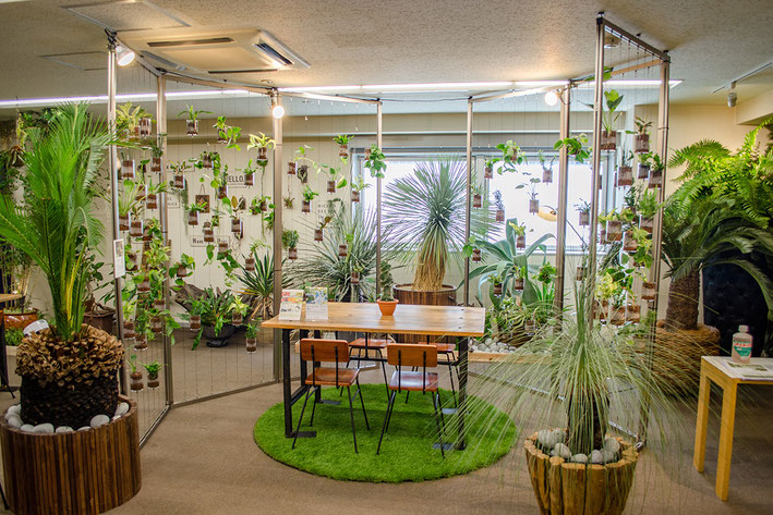 窓枠にはめ込み式で導入した事例はあったアルティマ グリューネ・フェンスター(ディスプレイ)ですが、今回、日比谷花壇様のご要望で空間デザインにもなり、パーテーション代わりにもなるアルティマ グリューネ・フェンスター(ディスプレイ)を施工しました。