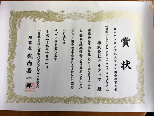 2017年10月11日に屋内緑化コンクール2017表彰式があり、アルティマ グリューネ・フェンスターが【(一社) 日本ハンギングバスケット協会理事長賞】を受賞致しました。