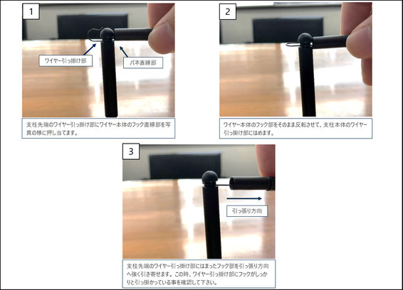 ※ 支柱先端のワイヤー引っ掛け部分にワイヤー本体両端部のフックを取り付ける方法になります、