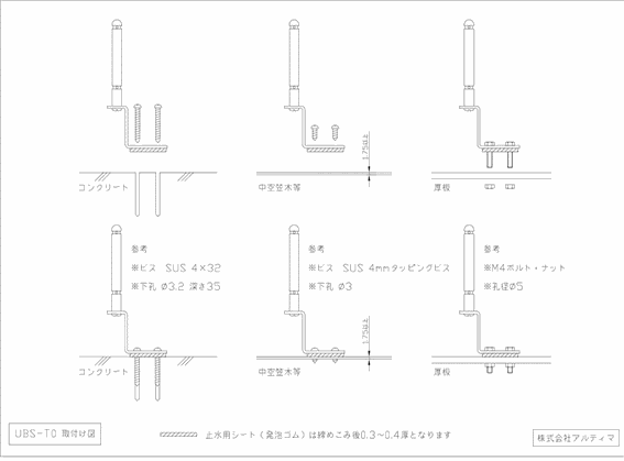 ビス止め用支柱 UBS-T0、UBS-T0 B、UBS-T0 Dを出荷する際、取付ビスは付属しておりません。