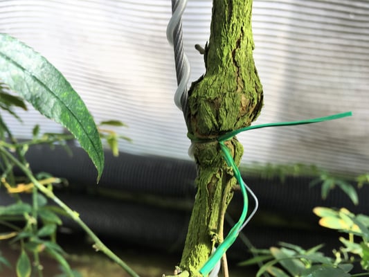 ➡ 植物の肥大により、ワイヤーがつるに喰い込み、結束部の上部が枯死する