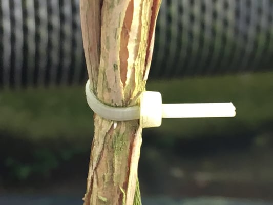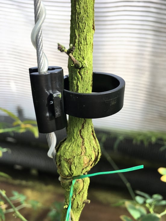 結束資材の爪が開く事で、つるの肥大を防ぐことが出来る。常に戻る方向に力がかかる為、緩む事もずり落ちる事もない