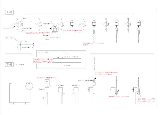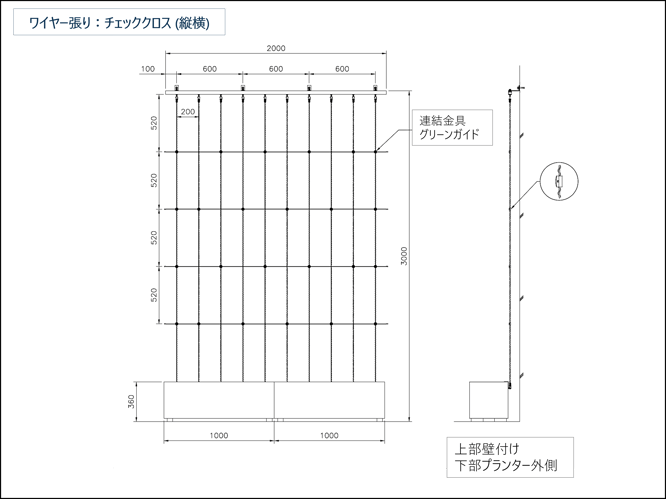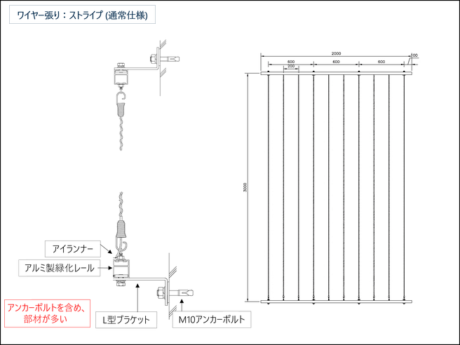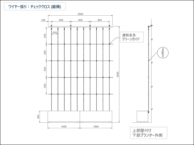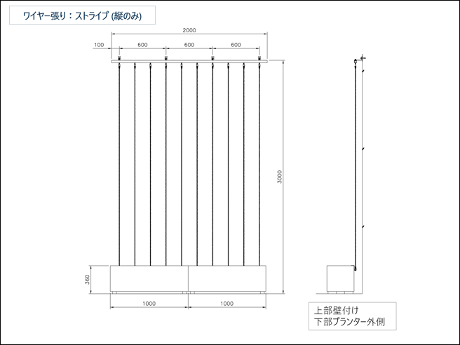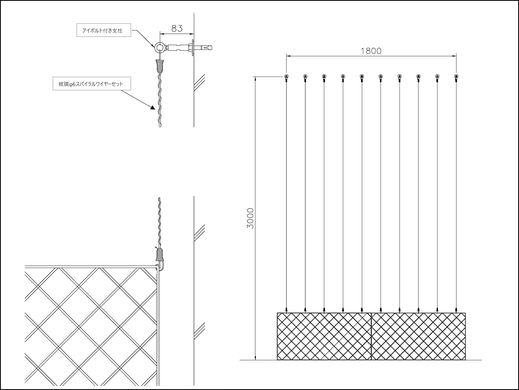 ※ ワイヤーセット1本辺りの荷重値は上端支持材、下端プランターに5kg~10kg程度になりますので、ご注意下さい。