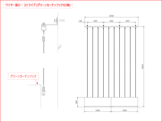 ※ 同条件で比較した場合、通常仕様よりも、グリーンカーテンフック仕様の方が、約11%安価となります。且つ、下端アンカーボルトが不要となります