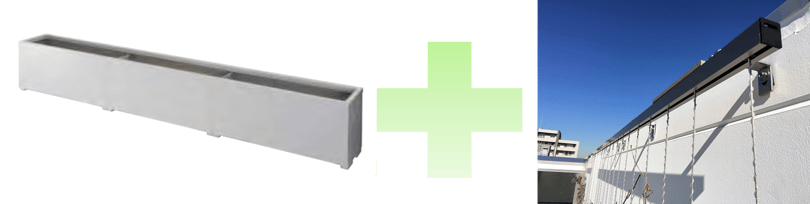グリーンカーテンフックを使用する事で、ワイヤー・プランター一体型壁面緑化を実現出来ました。