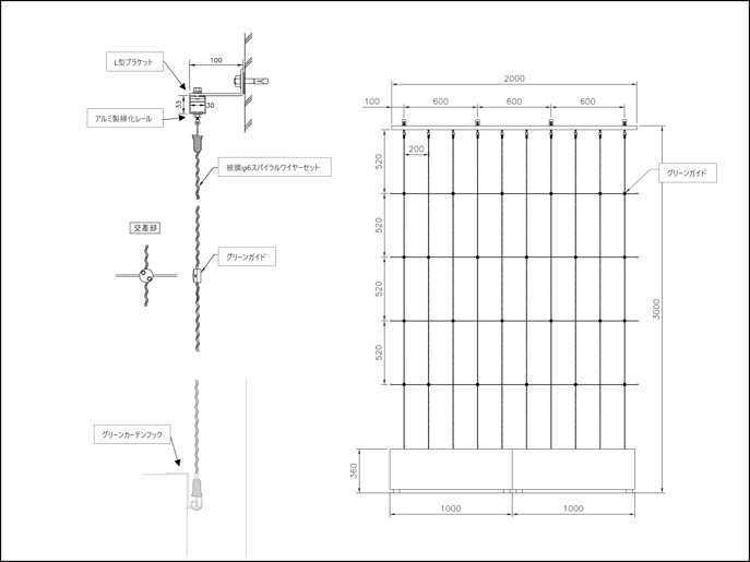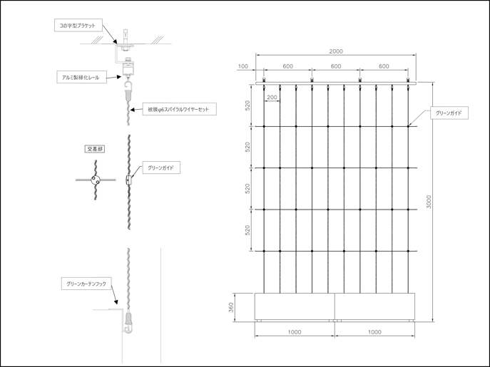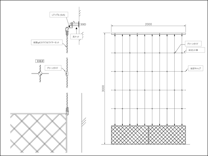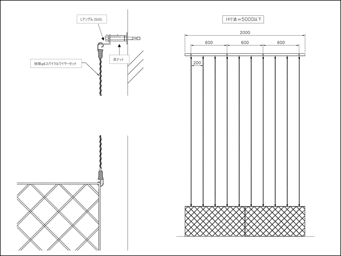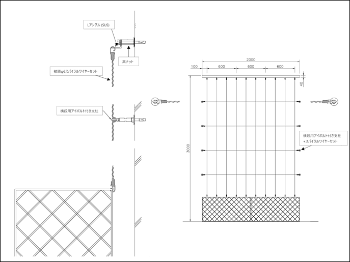 寸法例:W2,000mm×H3,000mm (ワイヤーピッチ@200mm×600mm)