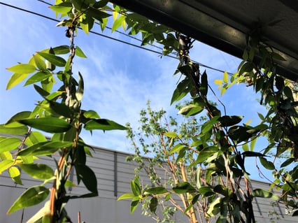 台風などの強風が吹くような時、通常のステンレスワイヤーと比べ、被膜φ6 スパイラルワイヤーはスパイラル状(ら旋状)に植物がしっかりと絡み付いているので、風による被害を軽減できます。