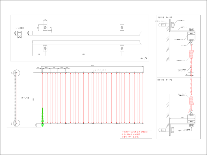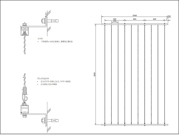 寸法例:W2,000mm×H3,000mm (ワイヤーピッチ@200mm) ワイヤー張り:ストライプ (縦のみ)、パターン① (ワイヤーセット)