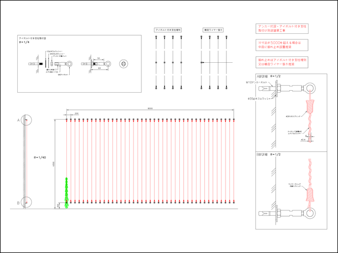 ※ 安全の為、5m以上はワイヤー振れ止めとして、中間部にアイボルト付き支柱+ワイヤーセット設置を推奨します。