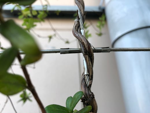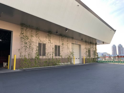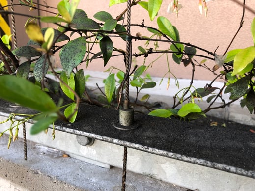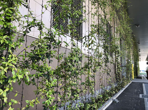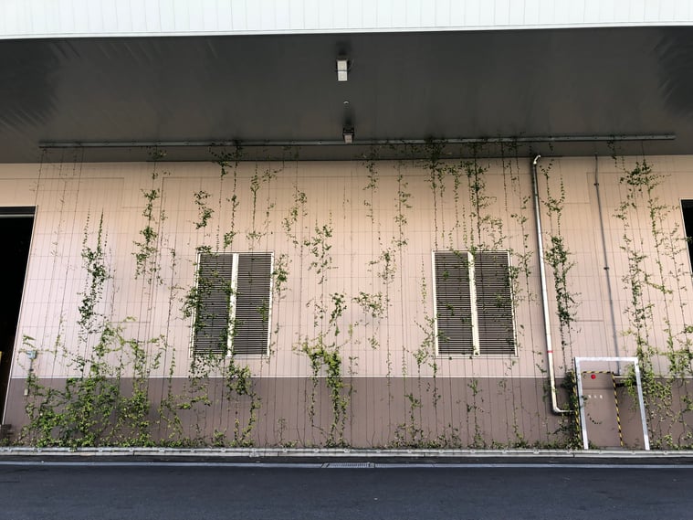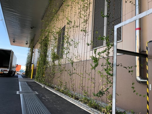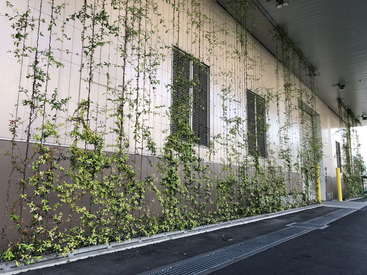 備考:2017年2月に施工。江東区有明ふ頭貨物上屋壁面に施工。植栽は地植え、φ3 SUSワイヤー使用。縦ワイヤーに対し、横ロット棒をワイヤー交差部に十字金具を使用し、チェッククロス仕様に。