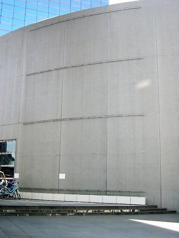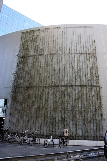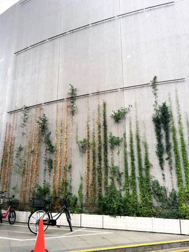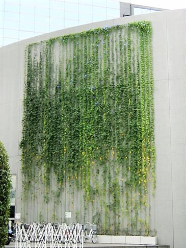 備考:2009年3月に施工。新宿区大久保のコズミックセンター壁面に設置。植栽はプランター、ワイヤー張りパターンはストライプ、被膜φ6 スパイラルワイヤー使用。時期によって、植栽の成長にバラつきあり。