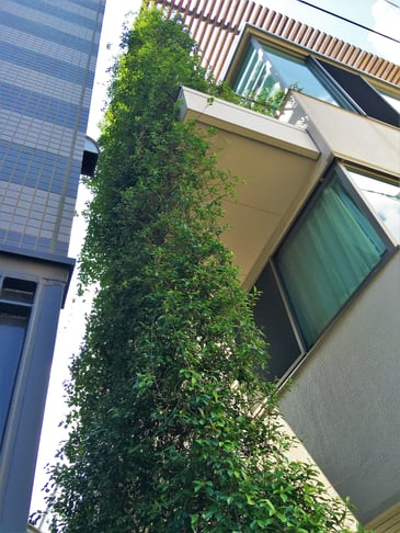 植栽は地植え、1階から3階までの空間をワイヤー壁面緑化により、綺麗に仕上がっている