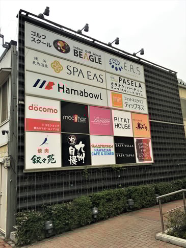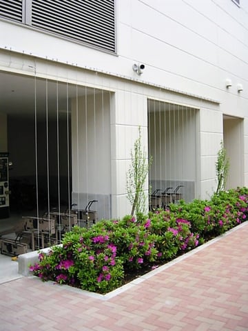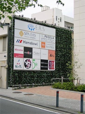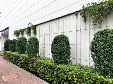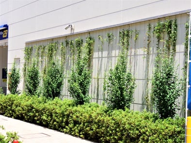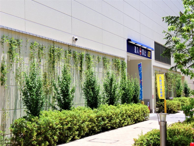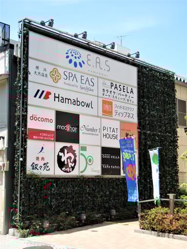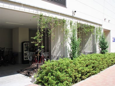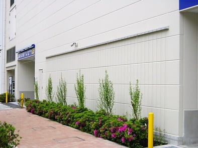 備考:2009年1月に施工。横浜市西区のショッピングモール壁面に設置。駐車場入り口横の壁面と、テナント広告版を壁面緑化。植栽は地植え、被膜φ6スパイラルワイヤー使用。ワイヤー張りパターンはストライプ。2010年までは比較的綺麗な壁面緑化が出来てはいたが、2016年6月時点では、植栽の生育が悪い。メンテナンスの問題もしくは、気温の問題でこれから伸びるてくる可能性もある。