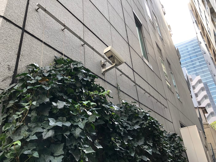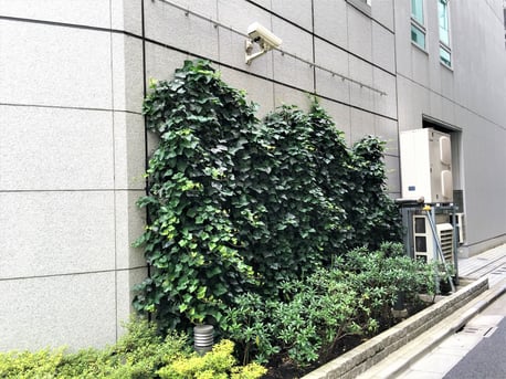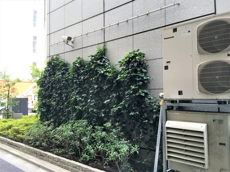 備考:2009年6月に施工。千代田区内神田、オフィスビル壁面に設置。植栽は地植え、ワイヤーパターンはストライプ。比較的に植栽の成長も順調、綺麗な壁面緑化に仕上がっている。