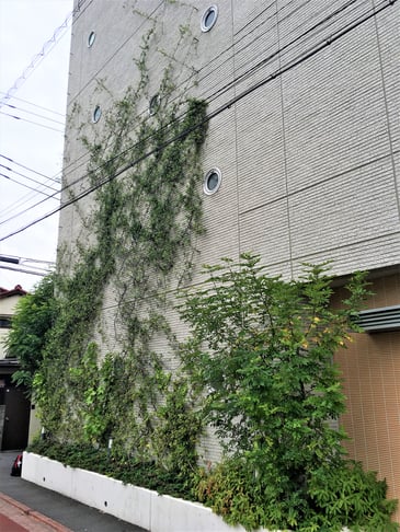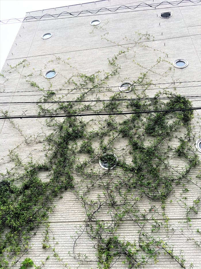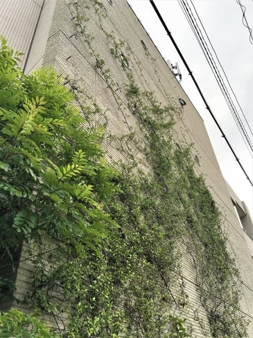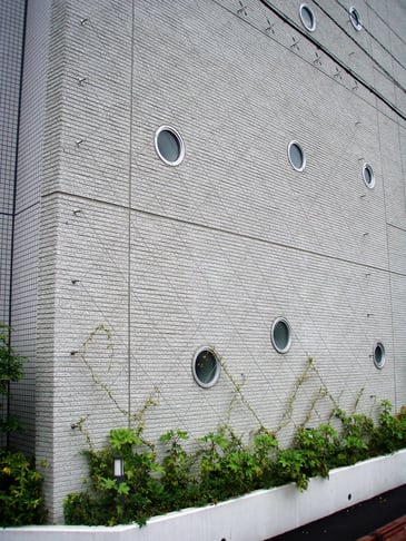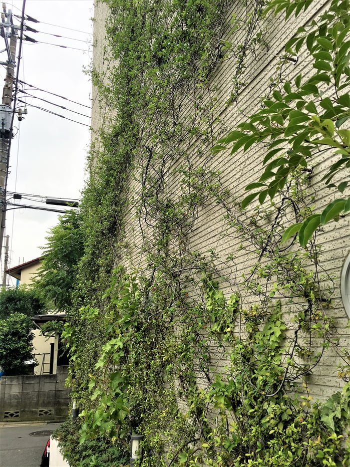 備考:2008年12月に施工。大田区西蒲田のマンション壁面に設置。植栽は地植え、被膜φ6スパイラルワイヤー使用。ワイヤーパターンはダイヤクロス。ところどころ、透けている所あり、メンテナンスもあまり出来ていない印象。