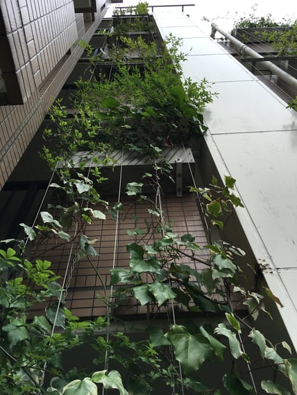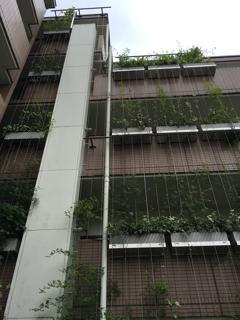 植栽は各フロアに設置したプランター、ワイヤーパターンはストライプ、φ3 ステンレスワイヤー使用。
