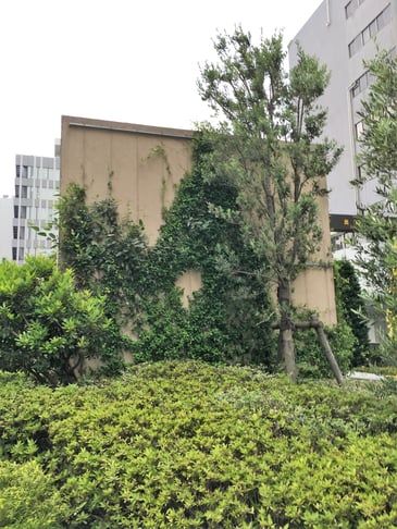 備考:2012年4月に施工。港区芝オフィスビル壁面に設置。植栽は地植え、ワイヤーパターンはストライプ、被膜φ6スパイラルワイヤー使用。綺麗な壁面緑化になっている。