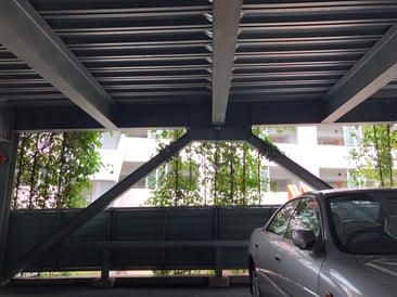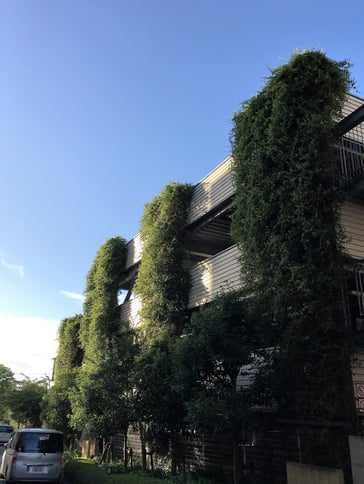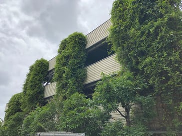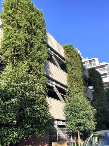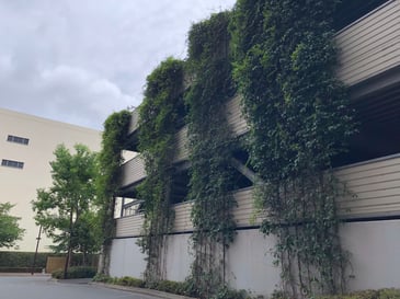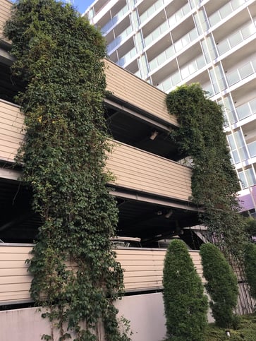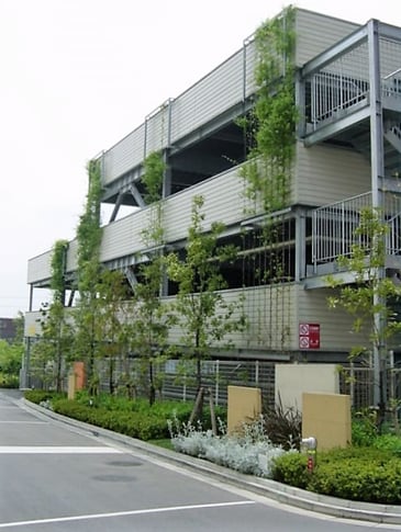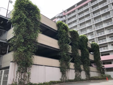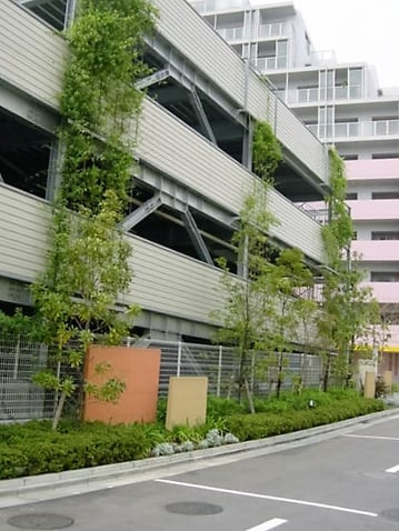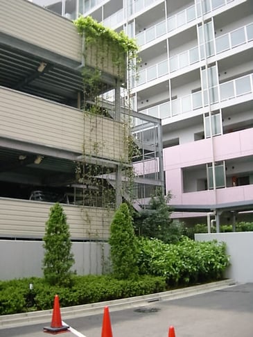 備考:2005年に施工。集合住宅の立体型駐車場にワイヤーでの壁面緑化を実施。地植えという事もあり、施工から11年経っても植栽は順調に成長し、綺麗なグリーンを保っています。光の当たり具合(日向、日陰)によって、植栽の上がり方は様々ですが、遠くから見ると壁面緑化とは気付かないほど、良く伸びています。実際、普通に木が連なっているのかと勘違いしたほどです。同集合住宅の周りには、商業施設などもなく、余計に緑が目立ちます。緑があるのと、ないとでは全く印象が違うと言える例だと思います。