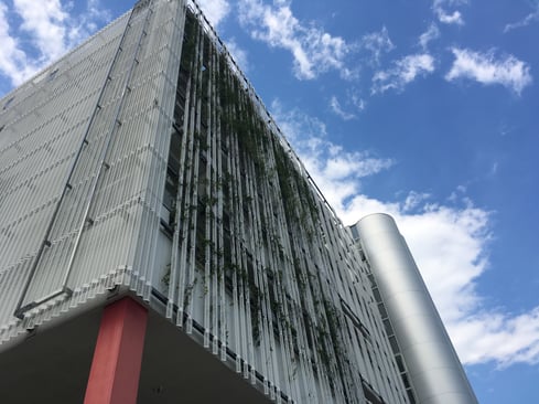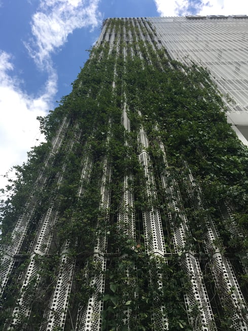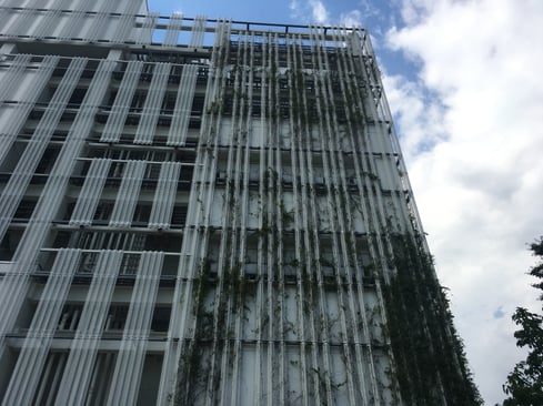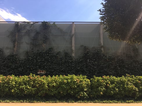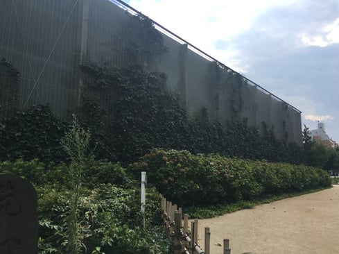 備考:2010年10月に施工。墨田区総合体育館に壁面緑化を実施。植栽は各フロアにプランターを設置し、ワイヤーに誘引、被膜φ6スパイラルワイヤー使用。ワイヤーパターンはストライプ。メンテナンスが原因か、あまり綺麗に植栽が上がっていっていない。