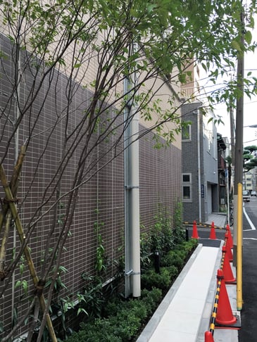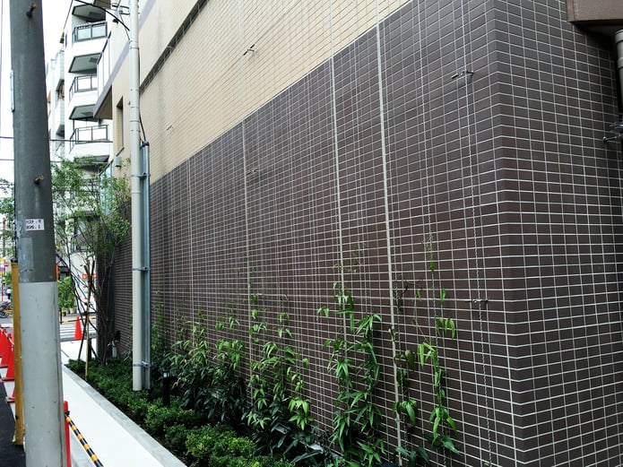 備考:2016年6月に施工。新築マンション壁面を緑化。上野御徒町新築マンションの壁面緑化。高さ約3m、幅約8m。緑化専用ワイヤーを29本使用。壁面と被膜φ6スパイラルワイヤーの距離を一定に保ち、風通りを良くする為に横ワイヤーを3本使用。植栽はまだ伸びていないので壁面緑化としては寂しいが、今後マンション側の水遣り等で伸びていくと思われます。中間振れ止めは、アイボルト付き支柱+ワイヤー。