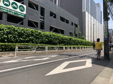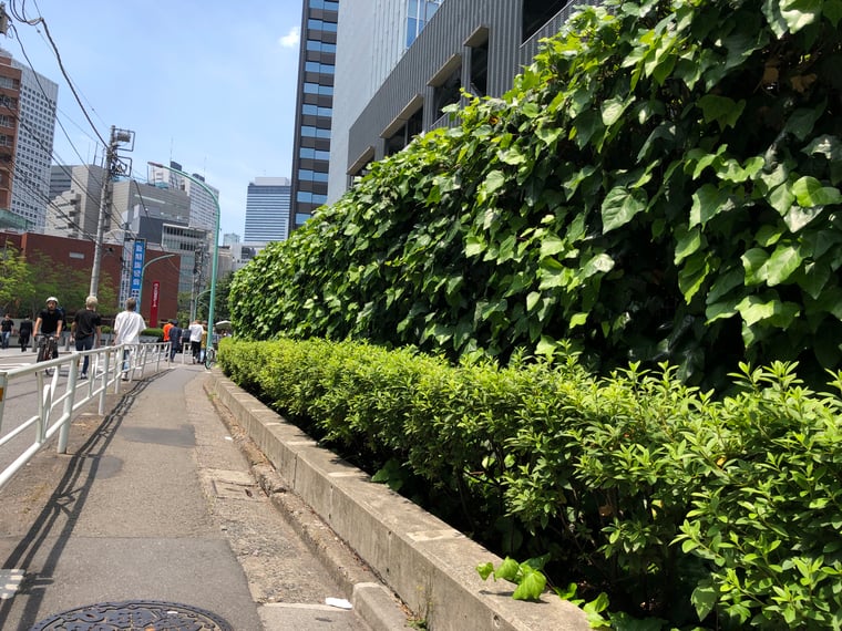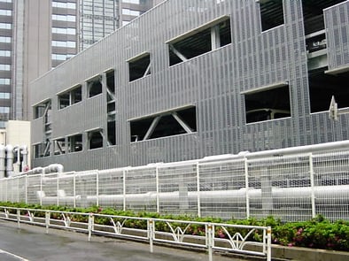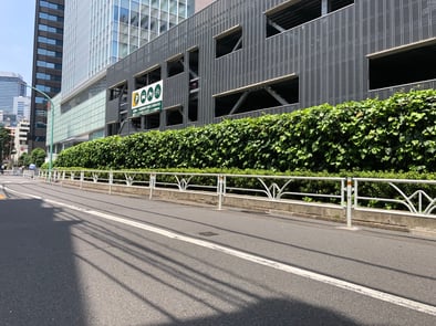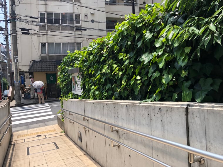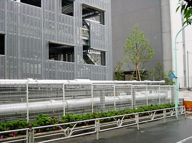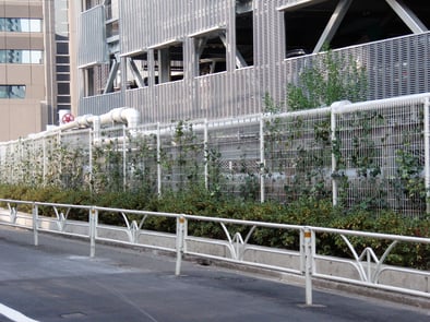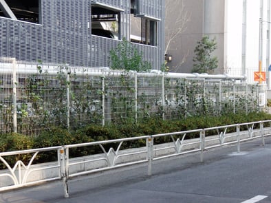 備考:2009年4月に施工。渋谷区代々木の東京総合病院の駐車場前壁面に設置。植栽は地植え、ワイヤーパターンはストライプ、被膜φ6スパイラルワイヤー使用。植栽の成長は非常に良好。ヘデラを使用している事もあり、緑視率が高い。