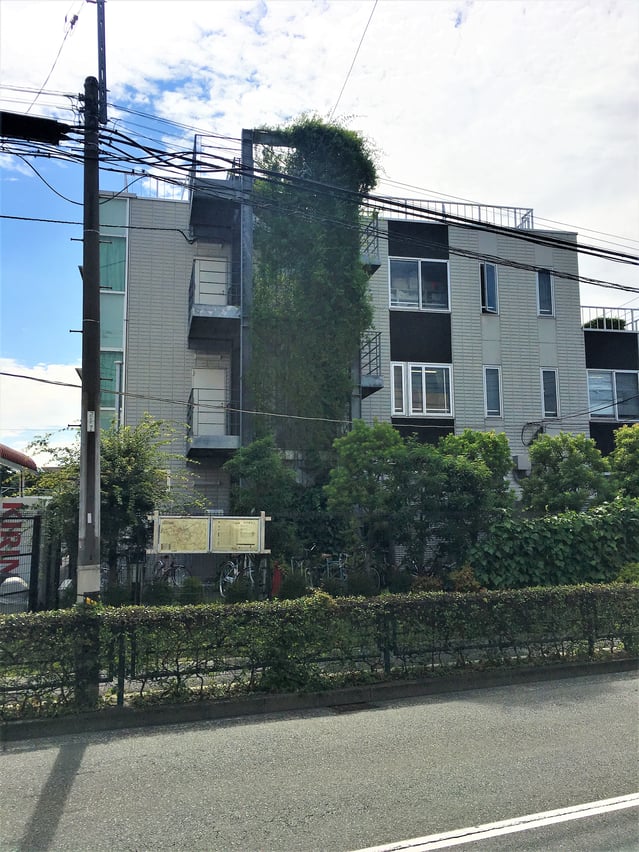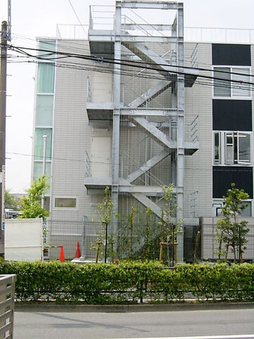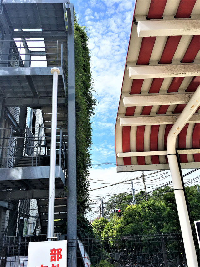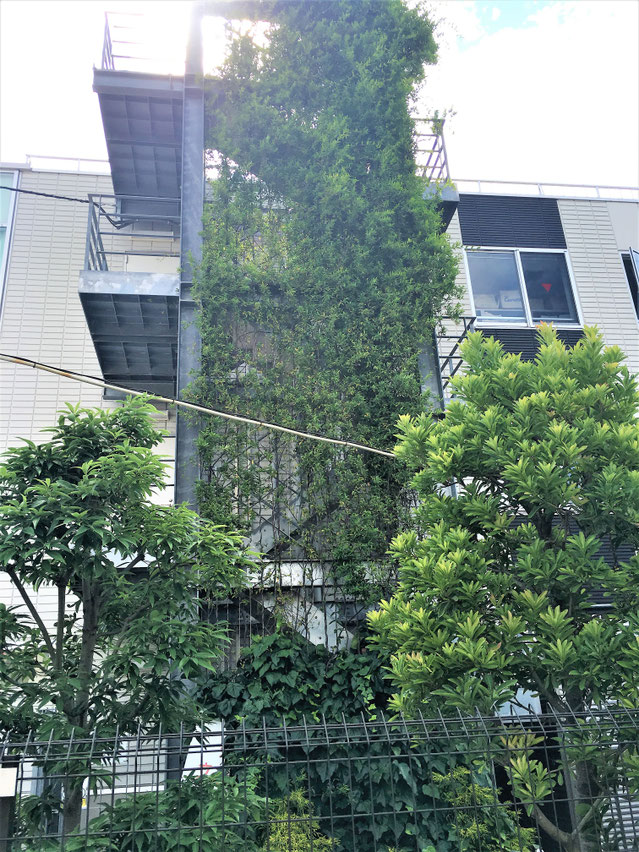 備考:2009年1月に施工。世田谷区弦巻のバス営業所外階段に設置。植栽は地植え、ワイヤーパターンはストライプ。施工して7年経過し、比較的順調に成長していると思われる。
