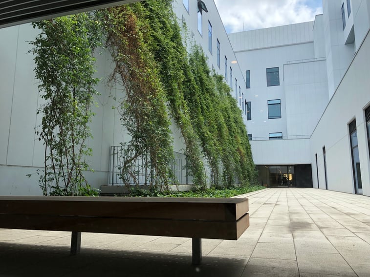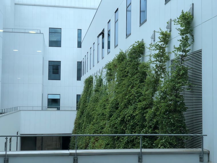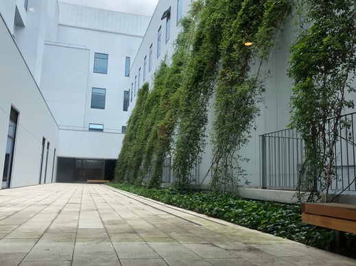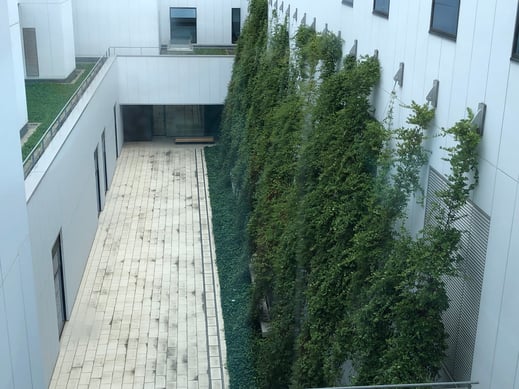 備考:2016年3月に施工。江東区豊洲新市場管理棟敷地内の中庭に設置。植栽は地植え、被膜φ6スパイラルワイヤー使用。上部は躯体からの持ち出しにグリップルで取り付け。3フロアにまたがる吹き抜けに施工。