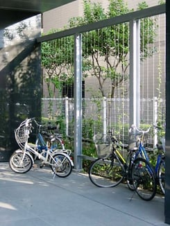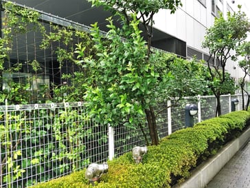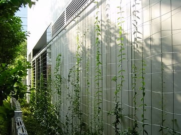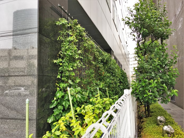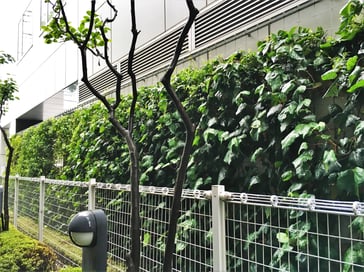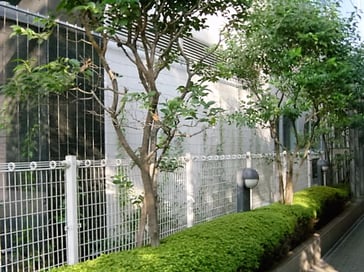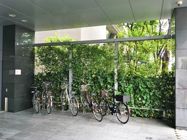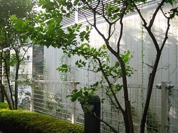 備考:2008年6月に施工。港区港南オフィスビル壁面に設置。オフィスビル、エントランスの駐輪場壁面を緑化。植栽は地植え、ワイヤーパターンはチェッククロス。多少透きのある所もあるが、基本的には植栽が良く成長しており、綺麗な壁面緑化に仕上がっている。