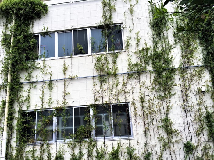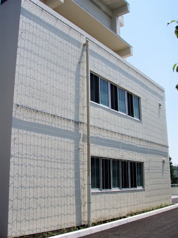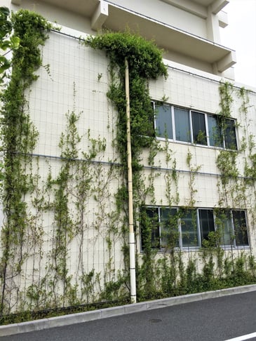 備考:2010年1月に施工。目黒区中央町福祉施設の壁面に設置。植栽は地植え、ワイヤーパターンはチェッククロス型、被膜φ6スパイラルワイヤー使用。メンテナンスが行き届いていないの、全体的に透きが多い。中間振れ止め:アイボルト付き支柱+ワイヤー