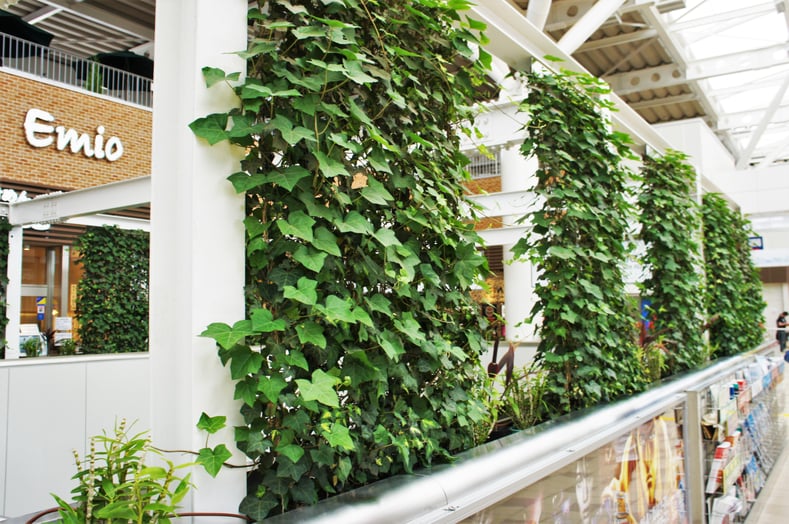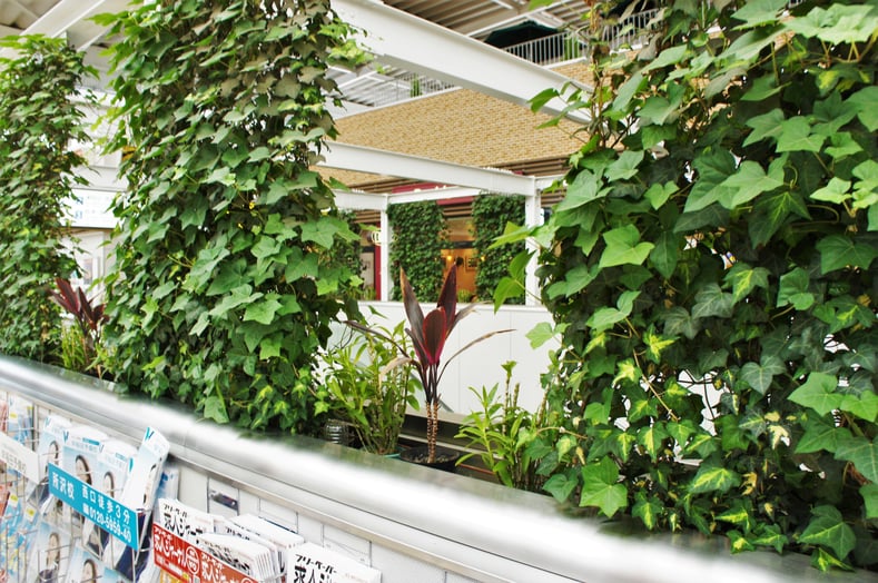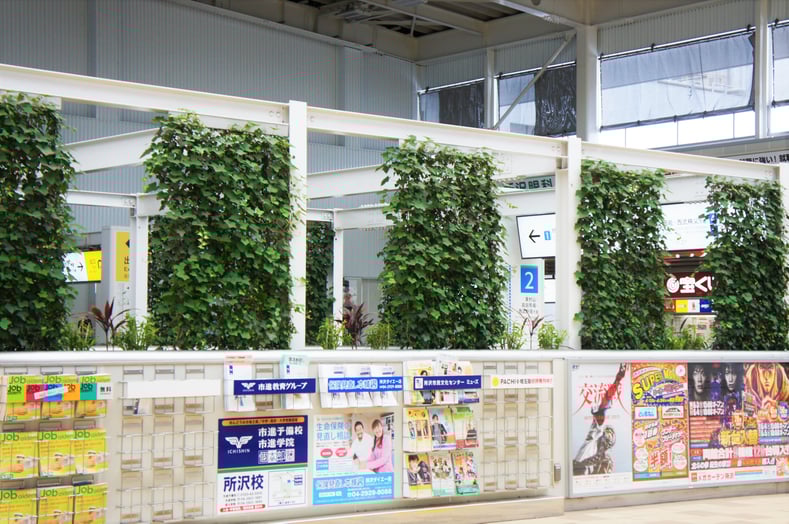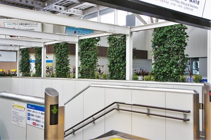ホーム階段横に緑化パーテーションとして設置。被膜φ6スパイラルワイヤー使用。