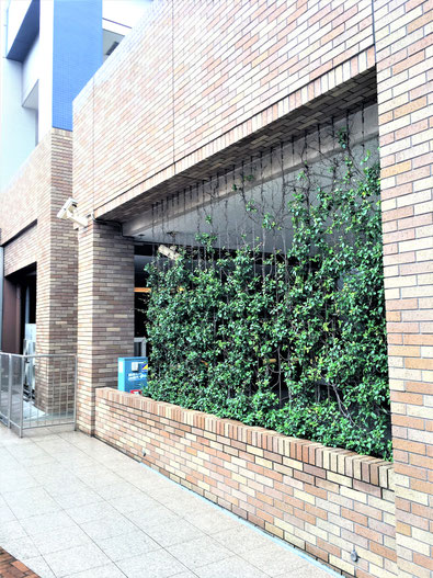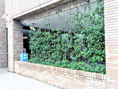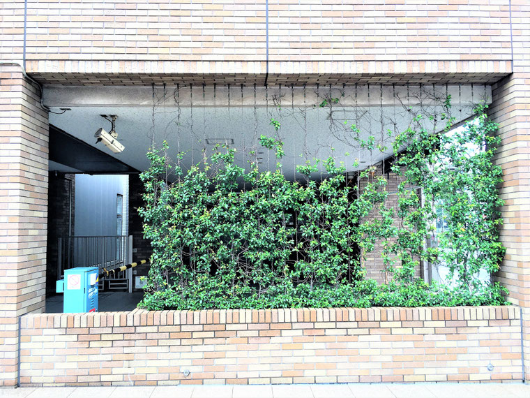備考:2009年1月に施工。千葉県千葉市マンション駐車場の壁面に設置。植栽は地植え、ワイヤーパターンはストライプ、被膜φ6スパイラルワイヤー使用。植栽の状態も良く、比較的に綺麗な壁面緑化に仕上がっている。