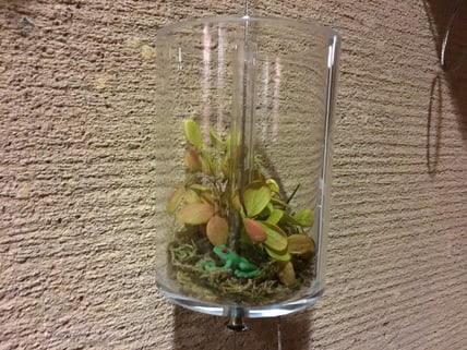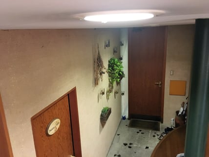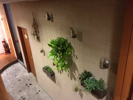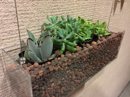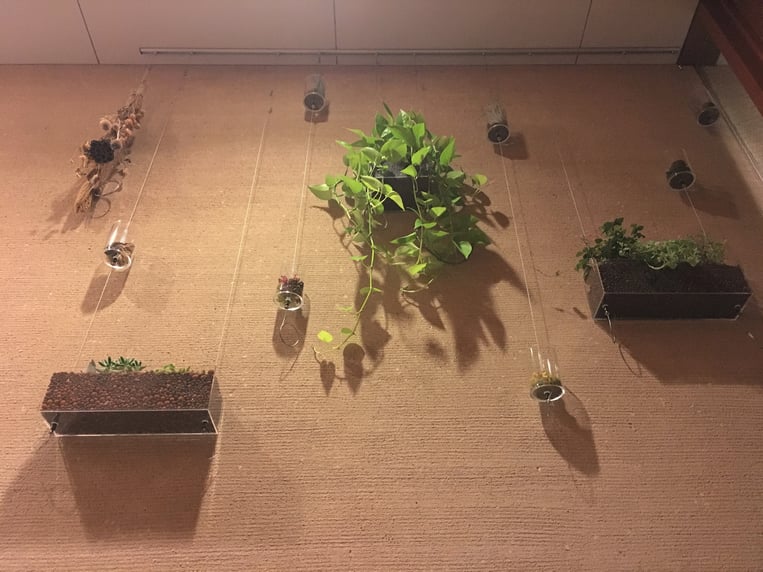 備考:ビス止め取付タイプ・インテリア・アンカーレール仕様。アルティマ グリューネ・フェンスター (ディスプレイ)、戸建て住宅に設置。テナントビル等を中心にはめ込み式、ビス止め取付式で施工してきたアルティマ グリューネ・フェンスター (ディスプレイ)を個人住宅向け仕様にアレンジし、戸建て住宅に設置。今までの天井部、床部にレールを取付し、ワイヤーにテンションをかけるやり方とは異なり、天井部のみにレールをビス止めし、ハンギングポッド等を吊るす形で取付。特注ハンギングケース (W360mm×H110mm×D110mm)を2個取付、中には小鉢植栽と多肉植物を入れ、プランターを空中に吊るしている。世界の何処にもないオリジナル空間デザインを戸建て住宅にも提案していける商材となっている。